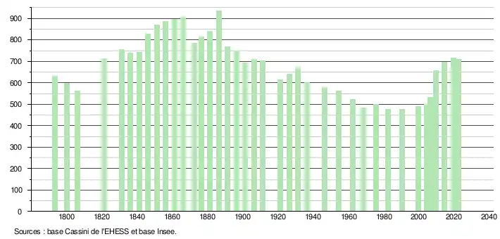 | L'évolution du nombre d'habitants est connue à travers les recensements de la population effectués dans la commune depuis 1793. Pour les communes de moins de 10 000 habitants, une enquête de recensement portant sur toute la population est réalisée tous les cinq ans, les populations de référence des années intermédiaires étant quant à elles estimées par interpolation ou extrapolation[19]. Pour la commune, le premier recensement exhaustif entrant dans le cadre du nouveau dispositif a été réalisé en 2004[20]. En 2022, la commune comptait 708 habitants[Note 2], en évolution de +0,57 % par rapport à 2016 (Charente-Maritime : +4,04 %, France hors Mayotte : +2,11 %). |