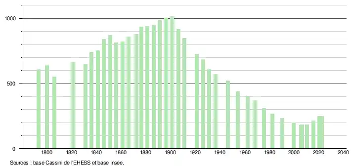 L'évolution du nombre d'habitants est connue à travers les recensements de la population effectués dans la commune depuis 1793. Pour les communes de moins de 10 000 habitants, une enquête de recensement portant sur toute la population est réalisée tous les cinq ans, les populations de référence des années intermédiaires étant quant à elles estimées par interpolation ou extrapolation[16]. Pour la commune, le premier recensement exhaustif entrant dans le cadre du nouveau dispositif a été réalisé en 2005[17].