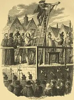 - ↑ Sous le règne de Jacques Ier, l'élite des catholiques décide de supprimer en même temps le roi, les lords et des membres des Communes réunis dans la Chambre des lords à la faveur d'un attentat. Privés de leurs représentants, une fois les enfants du roi enlevés, les protestants n'auraient guère résisté au soulèvement provoqué par les catholiques, soutenus par les Espagnols venus de Flandre. Guy Fawkes, gentilhomme aguerri par la campagne de Flandre, expert en sape, fut chargé de procéder à la mise en place de la mine. Une cave fut louée en face du lieu de réunion, mais un local fut découvert qui se trouvait au sous-sol de la Chambre des lords. Des barils de poudre, dissimulés par des fagots, y furent entassés. Fawkes devait allumer la mèche. Mais il fut arrêté le 5 novembre 1605 et supplicié. Le complot avait été découvert parce que les conjurés avaient mis dans la confidence les amis et relations dont ils avaient besoin pour le soulèvement qui devait suivre l'explosion. L'un de ces initiés, Tresham, saisi de scrupules, avait, par lettre, averti Monteagle, son parent, de ne pas se rendre au Parlement le jour de l'ouverture. Intrigué, Monteagle avertit les ministres, qui déclenchèrent immédiatement la répression. L'évènement est connu sous le nom de « Gunpowder plot ».