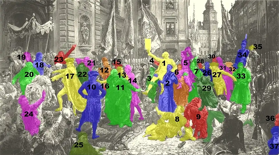 Dans le groupe de personnes rassemblées sous le roi, dans une autre reconnaissance de l'importance des bourgeois, se trouve le bourgeois Jan Kiliński (en) (24), l'un des dirigeants du soulèvement de Kościuszko[8]. À sa droite, en marge de la foule, se trouve le prêtre Clemens Maria Hofbauer (25), qui dirigeait un orphelinat et une école à Varsovie et est canonisé par l'église catholique[9].