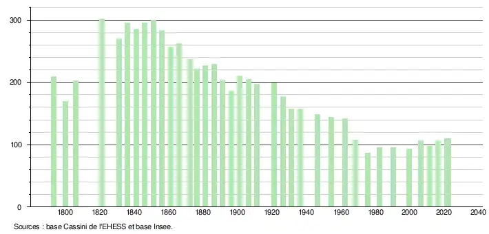 L'évolution du nombre d'habitants est connue à travers les recensements de la population effectués dans la commune depuis 1793. Pour les communes de moins de 10 000 habitants, une enquête de recensement portant sur toute la population est réalisée tous les cinq ans, les populations de référence des années intermédiaires étant quant à elles estimées par interpolation ou extrapolation[19]. Pour la commune, le premier recensement exhaustif entrant dans le cadre du nouveau dispositif a été réalisé en 2006[20].