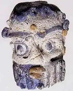 Se distingue une petite tête punique en pâte de verre vert et polychrome (blanc, jaune et bleu). La figure représente un homme aux cheveux bouclés, aux sourcils larges, aux yeux fous, au nez large, à la bouche aux lèvres proéminentes et à la longue barbe touffue peignée en boucles. Le front, le nez et les pommettes sont blancs ; cheveux et barbe bleu foncé brillant et lèvres jaunes. Ces petites têtes seraient créées et diffusées dans tout le monde phénicien et punique à caractère religieux et funéraire à vocation apotropaïque (IVe siècle av. J.-C.). Elles seraient accompagnées de colliers de perles en pâte de verre et de vases polychromes[10].