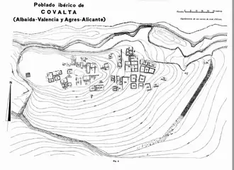D'autres auteurs qui se sont concentrés sur le site de La Covalta ont été Manuela Raga, qui a réalisé sa thèse de licence en 1994 dirigée par l'archéologue Carmen Aranegui sur une étude complète de la culture matérielle du site, en réalisant un inventaire détaillé et complet des matériaux[6]. Deux ans plus tard, en 1996, le Département de la Culture, de l'Éducation et des Sciences du Gouvernement valencien lui a confié la réalisation d'une nouvelle planimétrie du site, en révisant la précédente réalisée par Mariano Jornet, conformément à l'état de l'agglomération qui reflétait quelles structures, après la propreté et l'adaptation de la surface du sommet, restaient debout et pouvaient être appréciées.