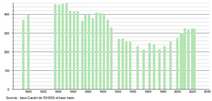 L'évolution du nombre d'habitants est connue à travers les recensements de la population effectués dans la commune depuis 1793. Pour les communes de moins de 10 000 habitants, une enquête de recensement portant sur toute la population est réalisée tous les cinq ans, les populations de référence des années intermédiaires étant quant à elles estimées par interpolation ou extrapolation[14]. Pour la commune, le premier recensement exhaustif entrant dans le cadre du nouveau dispositif a été réalisé en 2004[15].