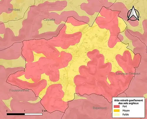 Le retrait-gonflement des sols argileux est susceptible d'engendrer des dommages importants aux bâtiments en cas d’alternance de périodes de sécheresse et de pluie[18]. La totalité de la commune est en aléa moyen ou fort (91,8 % au niveau départemental et 48,5 % au niveau national)[Carte 2]. Depuis le , en application de la loi ELAN, différentes contraintes s'imposent aux vendeurs, maîtres d'ouvrages ou constructeurs de biens situés dans une zone classée en aléa moyen ou fort[Note 2],[19].
