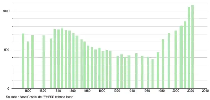 L'évolution du nombre d'habitants est connue à travers les recensements de la population effectués dans la commune depuis 1793. Pour les communes de moins de 10 000 habitants, une enquête de recensement portant sur toute la population est réalisée tous les cinq ans, les populations de référence des années intermédiaires étant quant à elles estimées par interpolation ou extrapolation[22]. Pour la commune, le premier recensement exhaustif entrant dans le cadre du nouveau dispositif a été réalisé en 2007[23].