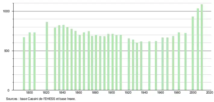 L'évolution du nombre d'habitants est connue à travers les recensements de la population effectués dans la commune depuis 1793. À partir du , les populations légales des communes sont publiées annuellement dans le cadre d'un recensement qui repose désormais sur une collecte d'information annuelle, concernant successivement tous les territoires communaux au cours d'une période de cinq ans. Pour les communes de moins de 10 000 habitants, une enquête de recensement portant sur toute la population est réalisée tous les cinq ans, les populations légales des années intermédiaires étant quant à elles estimées par interpolation ou extrapolation[10]. Pour la commune, le premier recensement exhaustif entrant dans le cadre du nouveau dispositif a été réalisé en 2005[11],[Note 1].