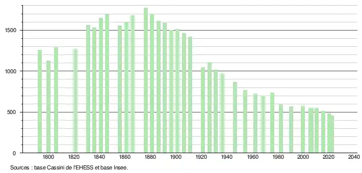 L'évolution du nombre d'habitants est connue à travers les recensements de la population effectués dans la commune depuis 1793. Pour les communes de moins de 10 000 habitants, une enquête de recensement portant sur toute la population est réalisée tous les cinq ans, les populations de référence des années intermédiaires étant quant à elles estimées par interpolation ou extrapolation[27]. Pour la commune, le premier recensement exhaustif entrant dans le cadre du nouveau dispositif a été réalisé en 2005[28].