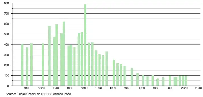 L'évolution du nombre d'habitants est connue à travers les recensements de la population effectués dans la commune depuis 1793. Pour les communes de moins de 10 000 habitants, une enquête de recensement portant sur toute la population est réalisée tous les cinq ans, les populations de référence des années intermédiaires étant quant à elles estimées par interpolation ou extrapolation[14]. Pour la commune, le premier recensement exhaustif entrant dans le cadre du nouveau dispositif a été réalisé en 2008[15].