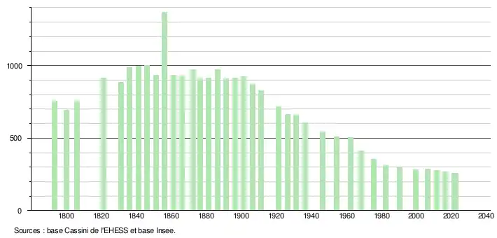 L'évolution du nombre d'habitants est connue à travers les recensements de la population effectués dans la commune depuis 1793. Pour les communes de moins de 10 000 habitants, une enquête de recensement portant sur toute la population est réalisée tous les cinq ans, les populations de référence des années intermédiaires étant quant à elles estimées par interpolation ou extrapolation[22]. Pour la commune, le premier recensement exhaustif entrant dans le cadre du nouveau dispositif a été réalisé en 2006[23].