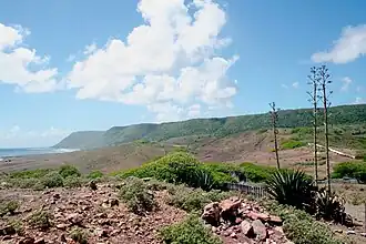 La Désirade est une île calcaire, un atoll surélevé[2], de forme allongée de onze kilomètres de longueur pour deux kilomètres de largeur soit 22 km2 environ, qui se présente comme un vaste plateau incliné vers le nord-ouest et dont La Grande-Montagne, qui atteint 275 mètres d'altitude, est le point culminant[3]. L'île propose divers sites d'un intérêt scientifique important. Car les affleurements, les roches (basaltiques, andésitiques, calcaires, biodétritiques, sédimentaires, etc.) ainsi que les plantes, permettent de reconstruire l'histoire de la formation des Petites Antilles, du Jurassique supérieur jusqu'à nos jours. Les côtes, plus découpées au nord et à l'est, sont souvent bordées de hautes falaises blanchâtres.