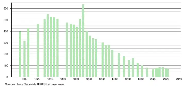 L'évolution du nombre d'habitants est connue à travers les recensements de la population effectués dans la commune depuis 1793. Pour les communes de moins de 10 000 habitants, une enquête de recensement portant sur toute la population est réalisée tous les cinq ans, les populations de référence des années intermédiaires étant quant à elles estimées par interpolation ou extrapolation[18]. Pour la commune, le premier recensement exhaustif entrant dans le cadre du nouveau dispositif a été réalisé en 2004[19].