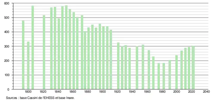 L'évolution du nombre d'habitants est connue à travers les recensements de la population effectués dans la commune depuis 1793. Pour les communes de moins de 10 000 habitants, une enquête de recensement portant sur toute la population est réalisée tous les cinq ans, les populations de référence des années intermédiaires étant quant à elles estimées par interpolation ou extrapolation[25]. Pour la commune, le premier recensement exhaustif entrant dans le cadre du nouveau dispositif a été réalisé en 2006[26].
