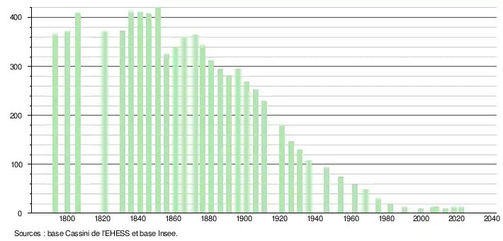 L'évolution du nombre d'habitants est connue à travers les recensements de la population effectués dans la commune depuis 1793. Pour les communes de moins de 10 000 habitants, une enquête de recensement portant sur toute la population est réalisée tous les cinq ans, les populations de référence des années intermédiaires étant quant à elles estimées par interpolation ou extrapolation[23]. Pour la commune, le premier recensement exhaustif entrant dans le cadre du nouveau dispositif a été réalisé en 2008[24].