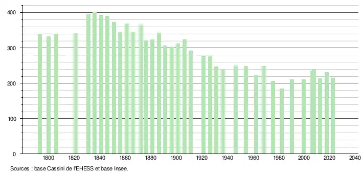 - ↑ Population municipale de référence en vigueur au 1er janvier 2025, millésimée 2022, définie dans les limites territoriales en vigueur au 1er janvier 2024, date de référence statistique : 1er janvier 2022.