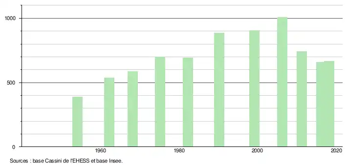 L'évolution du nombre d'habitants est connue à travers les recensements de la population effectués dans la commune depuis 1954. Pour les communes de moins de 10 000 habitants, une enquête de recensement portant sur toute la population est réalisée tous les cinq ans, les populations de référence des années intermédiaires étant quant à elles estimées par interpolation ou extrapolation[24]. Pour la commune, le premier recensement exhaustif entrant dans le cadre du nouveau dispositif a été réalisé en 2006[25].