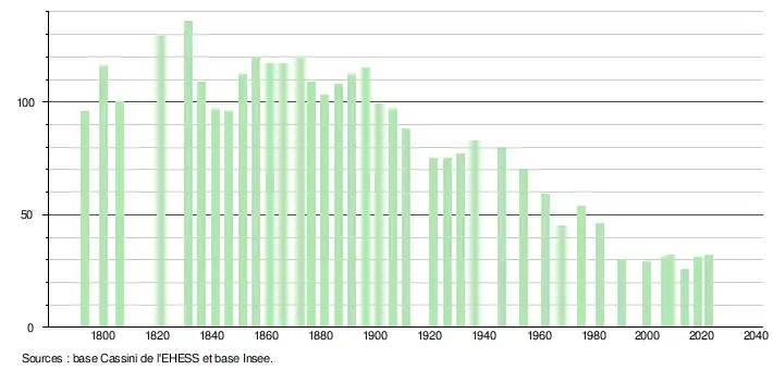 L'évolution du nombre d'habitants est connue à travers les recensements de la population effectués dans la commune depuis 1793. Pour les communes de moins de 10 000 habitants, une enquête de recensement portant sur toute la population est réalisée tous les cinq ans, les populations de référence des années intermédiaires étant quant à elles estimées par interpolation ou extrapolation[16]. Pour la commune, le premier recensement exhaustif entrant dans le cadre du nouveau dispositif a été réalisé en 2008[17].