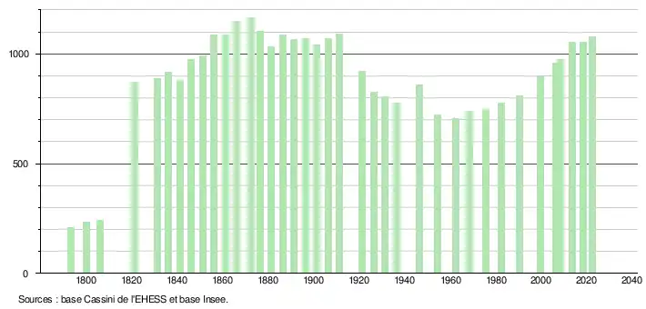 L'évolution du nombre d'habitants est connue à travers les recensements de la population effectués dans la commune depuis 1793. Pour les communes de moins de 10 000 habitants, une enquête de recensement portant sur toute la population est réalisée tous les cinq ans, les populations de référence des années intermédiaires étant quant à elles estimées par interpolation ou extrapolation[56]. Pour la commune, le premier recensement exhaustif entrant dans le cadre du nouveau dispositif a été réalisé en 2008[57].