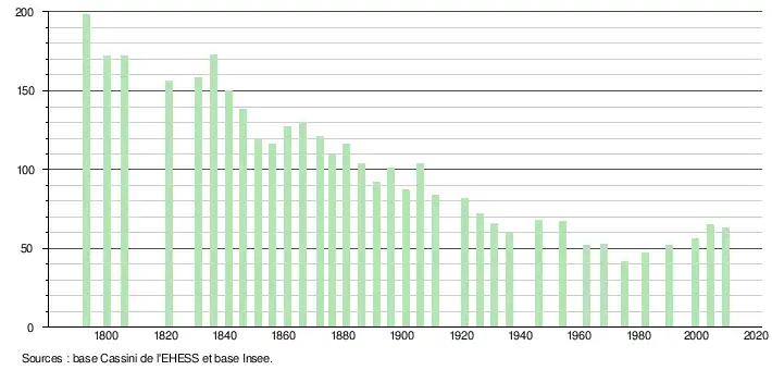 - ↑ Par convention dans Wikipédia, le principe a été retenu de n’afficher dans le tableau des recensements et le graphique, pour les populations légales postérieures à 1999, que les populations correspondant à une enquête exhaustive de recensement pour les communes de moins de 10 000 habitants, et que les populations des années 2006, 2011, 2016, etc. pour les communes de plus de 10 000 habitants, ainsi que la dernière population légale publiée par l’Insee pour l'ensemble des communes.