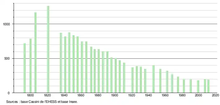 - ↑ Dans le tableau des recensements et le graphique, par convention dans Wikipédia, le principe a été retenu, pour les populations légales postérieures à 1999 de n’afficher dans le tableau des recensements et le graphique que les populations correspondant à l'année 2006, première population légale publiée calculée conformément aux concepts définis dans le décret no 2003-485 du 5 juin 2003, et les années correspondant à une enquête exhaustive de recensement pour les communes de moins de 10 000 habitants, ainsi que la dernière population légale publiée par l’Insee.