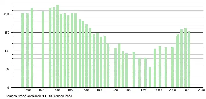 L'évolution du nombre d'habitants est connue à travers les recensements de la population effectués dans la commune depuis 1793. Pour les communes de moins de 10 000 habitants, une enquête de recensement portant sur toute la population est réalisée tous les cinq ans, les populations de référence des années intermédiaires étant quant à elles estimées par interpolation ou extrapolation[47]. Pour la commune, le premier recensement exhaustif entrant dans le cadre du nouveau dispositif a été réalisé en 2007[48].