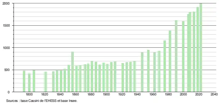 L'évolution du nombre d'habitants est connue à travers les recensements de la population effectués dans la commune depuis 1793. Pour les communes de moins de 10 000 habitants, une enquête de recensement portant sur toute la population est réalisée tous les cinq ans, les populations de référence des années intermédiaires étant quant à elles estimées par interpolation ou extrapolation[52]. Pour la commune, le premier recensement exhaustif entrant dans le cadre du nouveau dispositif a été réalisé en 2008[53].