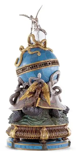 L’Univers, marqué par les signes du Zodiaque qui représentent la fuite du Temps, tient en équilibre sur la carapace de la tortue, maintenu par deux serpents. Deux passions humaines habitent l’univers : l’Amour/Compassion, éphèbe qui a déposé ses armes et l’Ambition/Egoïsme, jeune femme, qui rampe sur la voûte céleste, revêtue de la peau du lion de Némée[1].