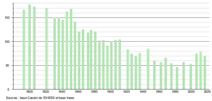 L'évolution du nombre d'habitants est connue à travers les recensements de la population effectués dans la commune depuis 1793. Pour les communes de moins de 10 000 habitants, une enquête de recensement portant sur toute la population est réalisée tous les cinq ans, les populations de référence des années intermédiaires étant quant à elles estimées par interpolation ou extrapolation[4]. Pour la commune, le premier recensement exhaustif entrant dans le cadre du nouveau dispositif a été réalisé en 2006[5].