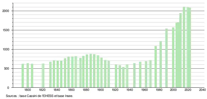 L'évolution du nombre d'habitants est connue à travers les recensements de la population effectués dans la commune depuis 1793. Pour les communes de moins de 10 000 habitants, une enquête de recensement portant sur toute la population est réalisée tous les cinq ans, les populations de référence des années intermédiaires étant quant à elles estimées par interpolation ou extrapolation[21]. Pour la commune, le premier recensement exhaustif entrant dans le cadre du nouveau dispositif a été réalisé en 2004[22].