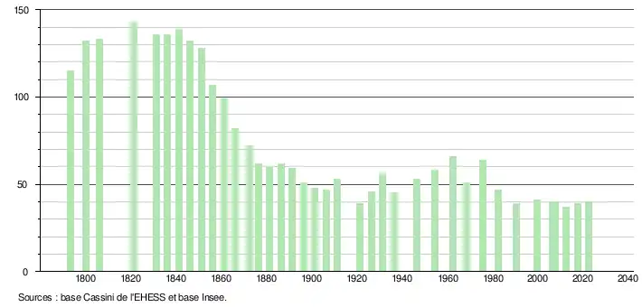 L'évolution du nombre d'habitants est connue à travers les recensements de la population effectués dans la commune depuis 1793. Pour les communes de moins de 10 000 habitants, une enquête de recensement portant sur toute la population est réalisée tous les cinq ans, les populations de référence des années intermédiaires étant quant à elles estimées par interpolation ou extrapolation[14]. Pour la commune, le premier recensement exhaustif entrant dans le cadre du nouveau dispositif a été réalisé en 2007[15].
