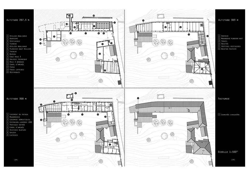 Les moulins semblent avoir été conçus en fonction du volume disponible tant leur occupation de l’espace est optimisée. D’une largeur de 5,57 m, donc assez courts par rapport à la norme, ils se développent sur toute la hauteur de la salle soit 4,80 m. Ils sont reliés deux à deux par un palier en bois commun sur lequel se tenaient les moulinières. Le plafond plat en poutres de bois et voûtains de brique de la salle des moulins participe à la rationalisation de l’espace. Une question subsiste : était-ce voulu, ou est-ce simplement la partie la plus ancienne du bâtiment ? Dans la Fabrique Basse, moulinage et dévidage occupent deux étages distincts séparés par un plancher plat en bois avec une sous-face en lattis plâtrés. Les moulins plus encombrants se trouvent au rez-de-chaussée. Là aussi, les machines occupent tout l’espace disponible. Les moulins de 3,50 m de haut vont du sol au plafond. Une nacelle coulissante permet l’accès à la partie supérieure des moulins. D’une longueur plus conventionnelle de 7,36 m, ils sont actionnés par le sommet en leur milieu. La roue hydraulique se situe toujours à proximité immédiate des machines consommant le plus d’énergie, en l’occurrence les moulins. Celle de la Fabrique Haute est cachée par un escalier en bois menant directement à la magnanerie. Une porte en bois à deux vantaux surmontée d’une imposte vitrée marque l’entrée de l’usine, de la cage à roue, de la magnanerie et de l'appartement du contremaître[9].