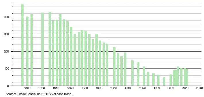 L'évolution du nombre d'habitants est connue à travers les recensements de la population effectués dans la commune depuis 1793. Pour les communes de moins de 10 000 habitants, une enquête de recensement portant sur toute la population est réalisée tous les cinq ans, les populations de référence des années intermédiaires étant quant à elles estimées par interpolation ou extrapolation[13]. Pour la commune, le premier recensement exhaustif entrant dans le cadre du nouveau dispositif a été réalisé en 2004[14].