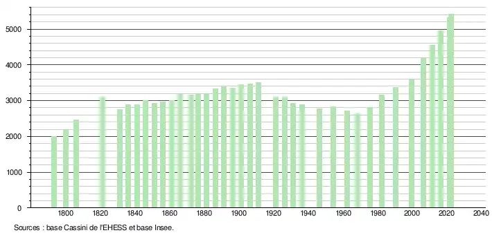 L'évolution du nombre d'habitants est connue à travers les recensements de la population effectués dans la commune depuis 1793. Pour les communes de moins de 10 000 habitants, une enquête de recensement portant sur toute la population est réalisée tous les cinq ans, les populations de référence des années intermédiaires étant quant à elles estimées par interpolation ou extrapolation[23]. Pour la commune, le premier recensement exhaustif entrant dans le cadre du nouveau dispositif a été réalisé en 2006[24].