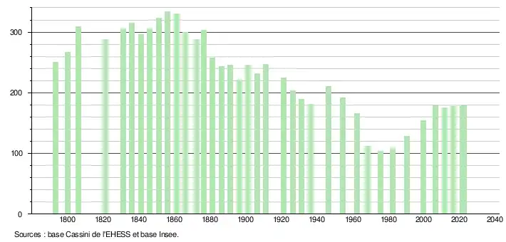 L'évolution du nombre d'habitants est connue à travers les recensements de la population effectués dans la commune depuis 1793. Pour les communes de moins de 10 000 habitants, une enquête de recensement portant sur toute la population est réalisée tous les cinq ans, les populations de référence des années intermédiaires étant quant à elles estimées par interpolation ou extrapolation[20]. Pour la commune, le premier recensement exhaustif entrant dans le cadre du nouveau dispositif a été réalisé en 2006[21].
