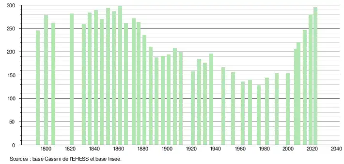 L'évolution du nombre d'habitants est connue à travers les recensements de la population effectués dans la commune depuis 1793. Pour les communes de moins de 10 000 habitants, une enquête de recensement portant sur toute la population est réalisée tous les cinq ans, les populations de référence des années intermédiaires étant quant à elles estimées par interpolation ou extrapolation[25]. Pour la commune, le premier recensement exhaustif entrant dans le cadre du nouveau dispositif a été réalisé en 2008[26].