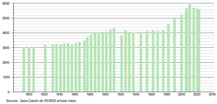 L'évolution du nombre d'habitants est connue à travers les recensements de la population effectués dans la commune depuis 1793. Pour les communes de moins de 10 000 habitants, une enquête de recensement portant sur toute la population est réalisée tous les cinq ans, les populations de référence des années intermédiaires étant quant à elles estimées par interpolation ou extrapolation[41]. Pour la commune, le premier recensement exhaustif entrant dans le cadre du nouveau dispositif a été réalisé en 2005[42].