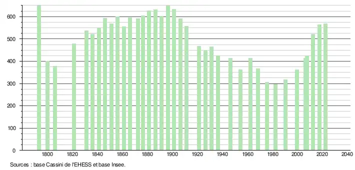 L'évolution du nombre d'habitants est connue à travers les recensements de la population effectués dans la commune depuis 1793. Pour les communes de moins de 10 000 habitants, une enquête de recensement portant sur toute la population est réalisée tous les cinq ans, les populations de référence des années intermédiaires étant quant à elles estimées par interpolation ou extrapolation[16]. Pour la commune, le premier recensement exhaustif entrant dans le cadre du nouveau dispositif a été réalisé en 2007[17].