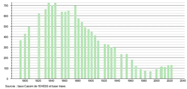 L'évolution du nombre d'habitants est connue à travers les recensements de la population effectués dans la commune depuis 1793. Pour les communes de moins de 10 000 habitants, une enquête de recensement portant sur toute la population est réalisée tous les cinq ans, les populations de référence des années intermédiaires étant quant à elles estimées par interpolation ou extrapolation[22]. Pour la commune, le premier recensement exhaustif entrant dans le cadre du nouveau dispositif a été réalisé en 2007[23].