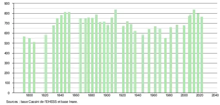 L'évolution du nombre d'habitants est connue à travers les recensements de la population effectués dans la commune depuis 1793. Pour les communes de moins de 10 000 habitants, une enquête de recensement portant sur toute la population est réalisée tous les cinq ans, les populations de référence des années intermédiaires étant quant à elles estimées par interpolation ou extrapolation[21]. Pour la commune, le premier recensement exhaustif entrant dans le cadre du nouveau dispositif a été réalisé en 2007[22].