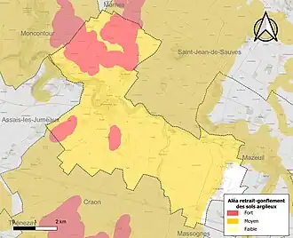 Les mouvements de terrains susceptibles de se produire dans la commune sont des affaissements et effondrements liés aux cavités souterraines (hors mines) et des tassements différentiels[16]. Afin de mieux appréhender le risque d’affaissement de terrain, un inventaire national permet de localiser les éventuelles cavités souterraines dans la commune[17]. Le retrait-gonflement des sols argileux est susceptible d'engendrer des dommages importants aux bâtiments en cas d’alternance de périodes de sécheresse et de pluie[18]. 94,8 % de la superficie communale est en aléa moyen ou fort (79,5 % au niveau départemental et 48,5 % au niveau national)[Carte 2]. Depuis le , en application de la loi ÉLAN, différentes contraintes s'imposent aux vendeurs, maîtres d'ouvrages ou constructeurs de biens situés dans une zone classée en aléa moyen ou fort[Note 1],[19].