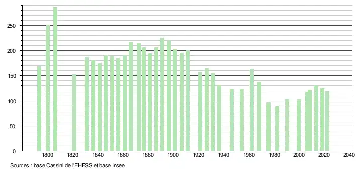L'évolution du nombre d'habitants est connue à travers les recensements de la population effectués dans la commune depuis 1793. Pour les communes de moins de 10 000 habitants, une enquête de recensement portant sur toute la population est réalisée tous les cinq ans, les populations de référence des années intermédiaires étant quant à elles estimées par interpolation ou extrapolation[24]. Pour la commune, le premier recensement exhaustif entrant dans le cadre du nouveau dispositif a été réalisé en 2008[25].
