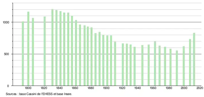 - ↑ Par convention dans Wikipédia, le principe a été retenu de n’afficher dans le tableau des recensements et le graphique, pour les populations légales postérieures à 1999, que les populations correspondant à une enquête exhaustive de recensement pour les communes de moins de 10 000 habitants, et que les populations des années 2006, 2011, 2016, etc. pour les communes de plus de 10 000 habitants, ainsi que la dernière population légale publiée par l’Insee pour l'ensemble des communes.