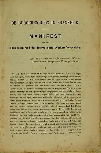 La première édition du document, une mince brochure de 35 pages, est d'abord publiée à Londres aux alentours du , avec comme titre The Civil War in France: Address of the General Council of the International Working-Men's Association (La Guerre civile en France: Adresse du Conseil général de l'Association Internationale des Travailleurs). Tirée à seulement mille exemplaires cette édition est rapidement épuisée. Une deuxième édition, moins chère et tirée à 2 000 exemplaires, lui fait suite, puis une troisième édition, toujours en anglais et contenant un certain nombre de corrections, paraît plus tard la même année[3]. Traduit en français, allemand, russe, italien, espagnol, néerlandais, flamand, croate, danois, polonais, ce texte est publié à la fois dans des journaux et sous forme de brochure dans divers pays en 1871-1872[3]. La traduction en allemand est rédigée par l'ami de longue date de Marx, Friedrich Engels, et la publication dans cette langue a d'abord lieu en feuilleton dans le journal Der Volkstaat en juin-, puis dans Der Vorbote en août-[3]. Une édition de la brochure est également publiée séparément par Volkstaat à Leipzig la même année[4]. Le texte est réédité lors du cinquième anniversaire de la chute de la Commune de Paris, Engels ayant apporté des corrections mineures à sa traduction. Une deuxième édition paraît à Leipzig, publiée cette fois par la Genossenschaftsbuchdrukerei[5].