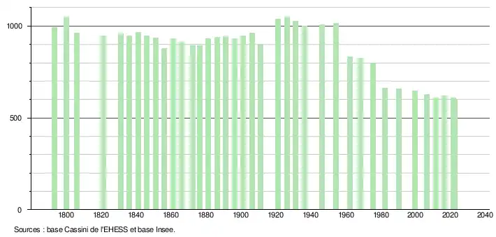 L'évolution du nombre d'habitants est connue à travers les recensements de la population effectués dans la commune depuis 1793. Pour les communes de moins de 10 000 habitants, une enquête de recensement portant sur toute la population est réalisée tous les cinq ans, les populations de référence des années intermédiaires étant quant à elles estimées par interpolation ou extrapolation[15]. Pour la commune, le premier recensement exhaustif entrant dans le cadre du nouveau dispositif a été réalisé en 2006[16].