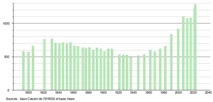 L'évolution du nombre d'habitants est connue à travers les recensements de la population effectués dans la commune depuis 1793. Pour les communes de moins de 10 000 habitants, une enquête de recensement portant sur toute la population est réalisée tous les cinq ans, les populations de référence des années intermédiaires étant quant à elles estimées par interpolation ou extrapolation[17]. Pour la commune, le premier recensement exhaustif entrant dans le cadre du nouveau dispositif a été réalisé en 2006[18].