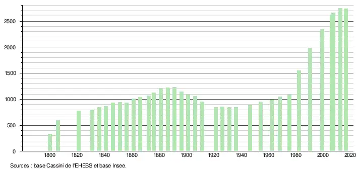 L'évolution du nombre d'habitants est connue à travers les recensements de la population effectués dans la commune depuis 1800. Pour les communes de moins de 10 000 habitants, une enquête de recensement portant sur toute la population est réalisée tous les cinq ans, les populations de référence des années intermédiaires étant quant à elles estimées par interpolation ou extrapolation[41]. Pour la commune, le premier recensement exhaustif entrant dans le cadre du nouveau dispositif a été réalisé en 2007[42].