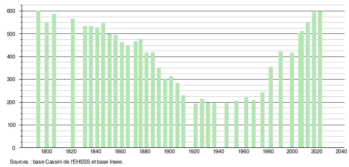 L'évolution du nombre d'habitants est connue à travers les recensements de la population effectués dans la commune depuis 1793. Pour les communes de moins de 10 000 habitants, une enquête de recensement portant sur toute la population est réalisée tous les cinq ans, les populations de référence des années intermédiaires étant quant à elles estimées par interpolation ou extrapolation[21]. Pour la commune, le premier recensement exhaustif entrant dans le cadre du nouveau dispositif a été réalisé en 2007[22].
