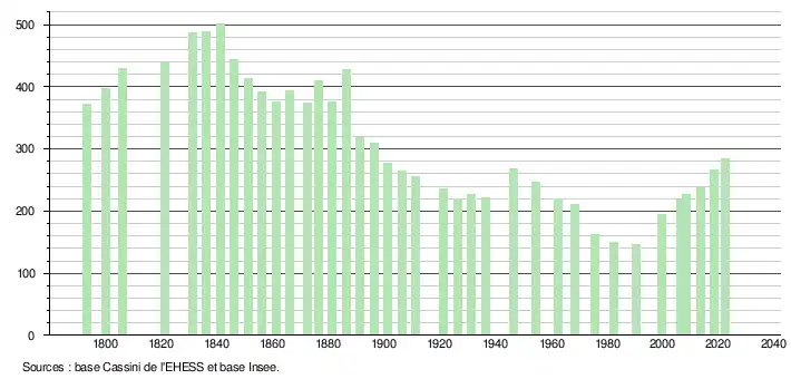 L'évolution du nombre d'habitants est connue à travers les recensements de la population effectués dans la commune depuis 1793. Pour les communes de moins de 10 000 habitants, une enquête de recensement portant sur toute la population est réalisée tous les cinq ans, les populations de référence des années intermédiaires étant quant à elles estimées par interpolation ou extrapolation[32]. Pour la commune, le premier recensement exhaustif entrant dans le cadre du nouveau dispositif a été réalisé en 2008[33].