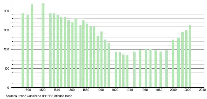 L'évolution du nombre d'habitants est connue à travers les recensements de la population effectués dans la commune depuis 1793. Pour les communes de moins de 10 000 habitants, une enquête de recensement portant sur toute la population est réalisée tous les cinq ans, les populations de référence des années intermédiaires étant quant à elles estimées par interpolation ou extrapolation[21]. Pour la commune, le premier recensement exhaustif entrant dans le cadre du nouveau dispositif a été réalisé en 2007[22].