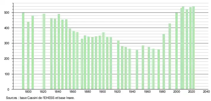 L'évolution du nombre d'habitants est connue à travers les recensements de la population effectués dans la commune depuis 1793. Pour les communes de moins de 10 000 habitants, une enquête de recensement portant sur toute la population est réalisée tous les cinq ans, les populations de référence des années intermédiaires étant quant à elles estimées par interpolation ou extrapolation[16]. Pour la commune, le premier recensement exhaustif entrant dans le cadre du nouveau dispositif a été réalisé en 2008[17].